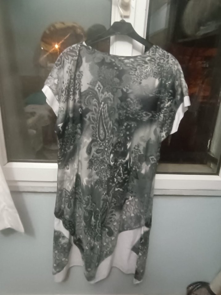 V yaka, kısa kollu, gri desenli, dökümlü, bol kesim kısa hamile tunik. Sentetik kumaştan, günlük sokak stili ve bohem tarz için uygun.