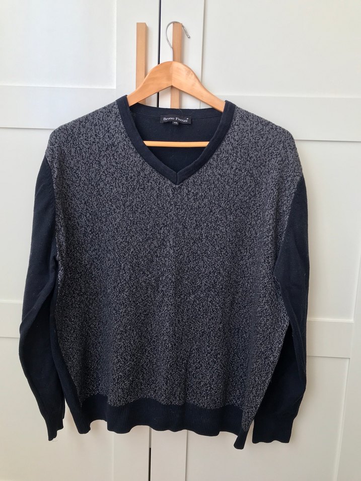 V yaka, uzun kollu, bol kesim erkek triko kazak. Gri renkte, ofis ve günlük kullanım için uygun.