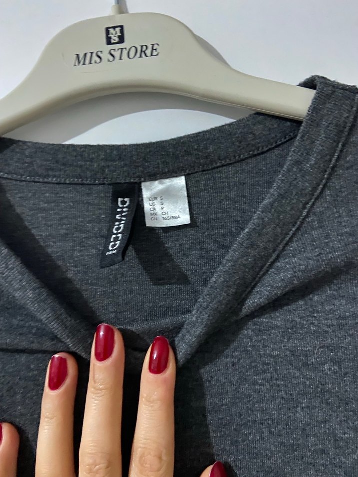 V yaka ve uzun kollu, fitted kadın gömlek. Düğmeli ve baskılı desenli, sentetik yumuşak kumaştan yapılmıştır. Gri renkte, günlük rahat kullanıma uygun midi uzunluğunda. ✨