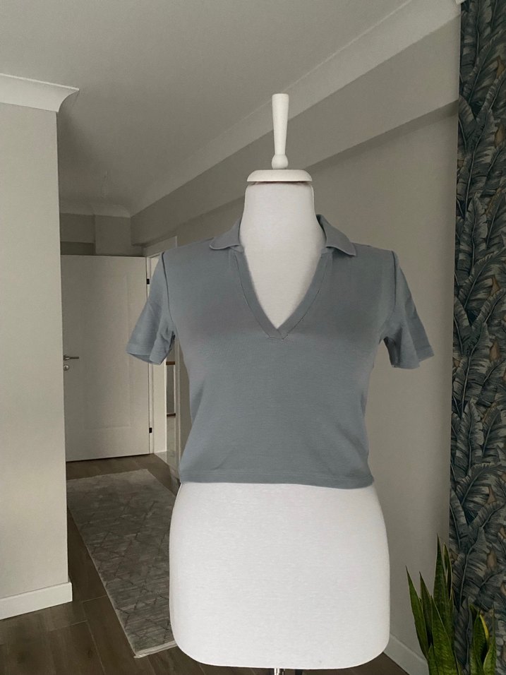 V yaka ve kısa kollu, gri renkte, dar kesim kadın tişörtü. Yumuşak sentetik kumaştan, minimal ve sokak tarzı için uygun, günlük kullanım için ideal.