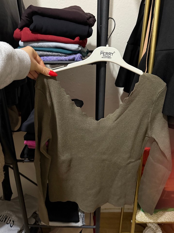 V yaka ve uzun kollu, gri tonlarda, sentetik kumaştan örülmüş, normal midi boyda, sade ve günlük kullanıma uygun kadın triko kazak. "FERRY" markalı askıda.