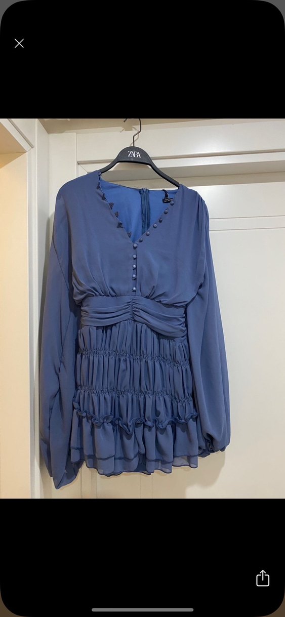 Gri midi elbise, V yaka, uzun kollu ve bol kesimli, fırfır detaylarıyla bohem ve avangart tarzda günlük kullanıma uygun.