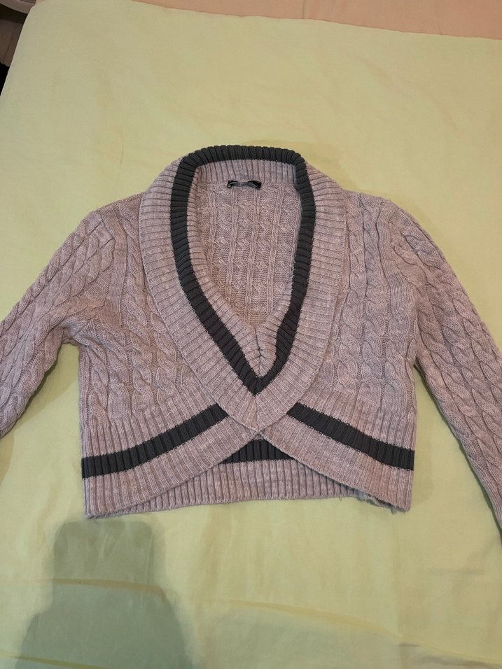 Bu fitted kadın kazak, uzun kollu ve derin V yaka detayına sahiptir. Yumuşak örgü kumaştan gri renkte olup kısa boyda ve siyah ince şeritlerle sokak tarzı rahat bir görünüme sahiptir.