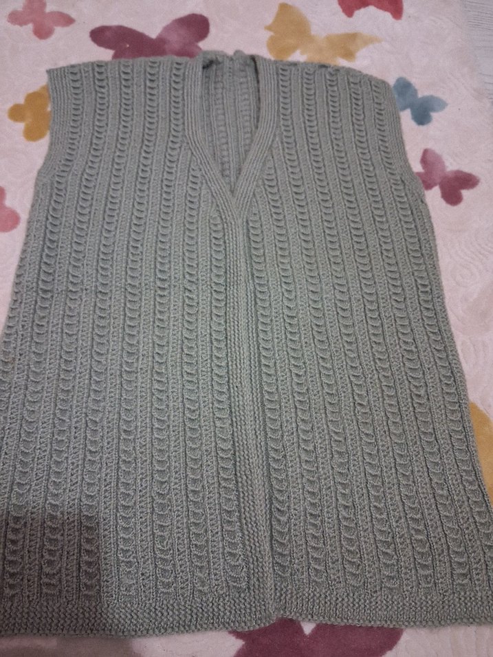 Gri renkli, V yakalı, yumuşak örgü kumaştan yapılmış kadın süveter. Gevşek kesim, midi boy ve kolsuz tasarıma sahiptir. el örgüsü yün yelek. sıfır çeyizlik ürünlerdir #örgüyelek. #çeyizlikelörgüsüyelek