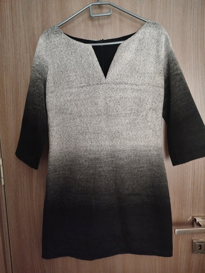 V yaka, kısa kollu gri triko hamile tunik, midi boyda ve bol kesimdir. Minimalist ve çağdaş stilde, günlük kullanım için uygundur.