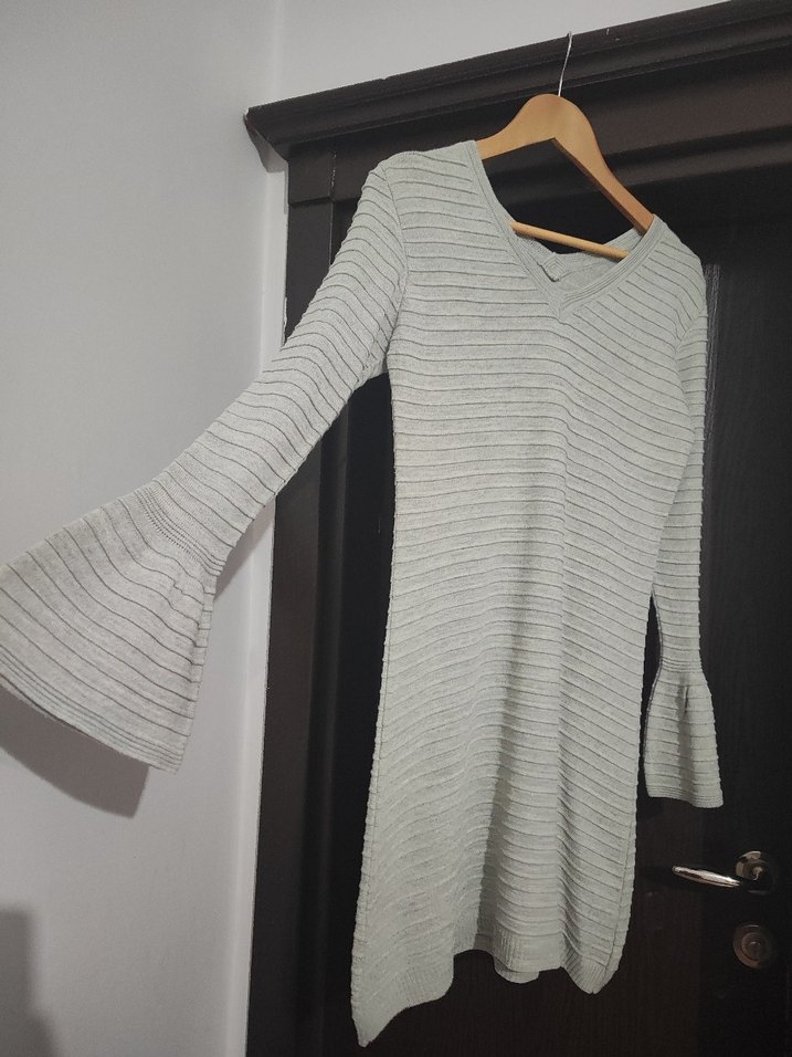 Gri renkte, V yakalı, uzun kollu ve bol kesim triko midi elbisedir. sayılı giyildi tesettürlü olduğum için fazla giyemedim Rahat ve bohem tarzıyla günlük kullanıma uygundur. #kadingiyim #üstgiyim #triko #tunik