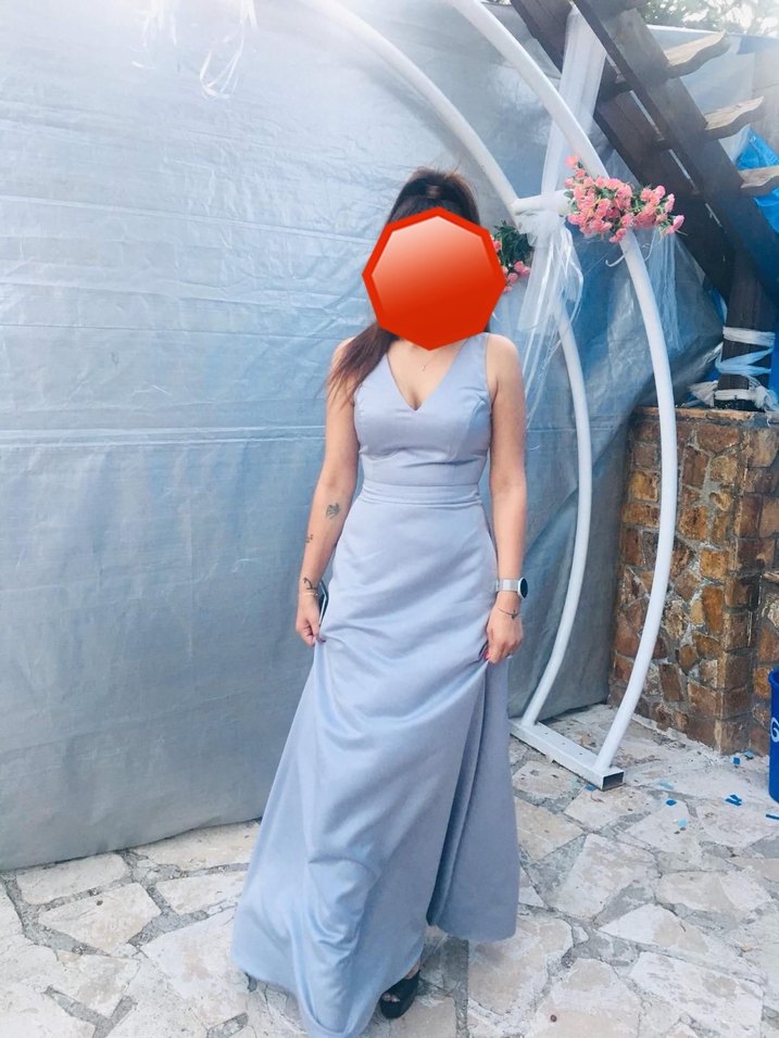 V yaka, drapeli ve vücuda oturan açık gri uzun elbise, yumuşak sentetik kumaştan üretilmiştir. Kolsuz ve desensizdir. 50 kilo iken kullandım etiket M beden ama S beden uyumludur