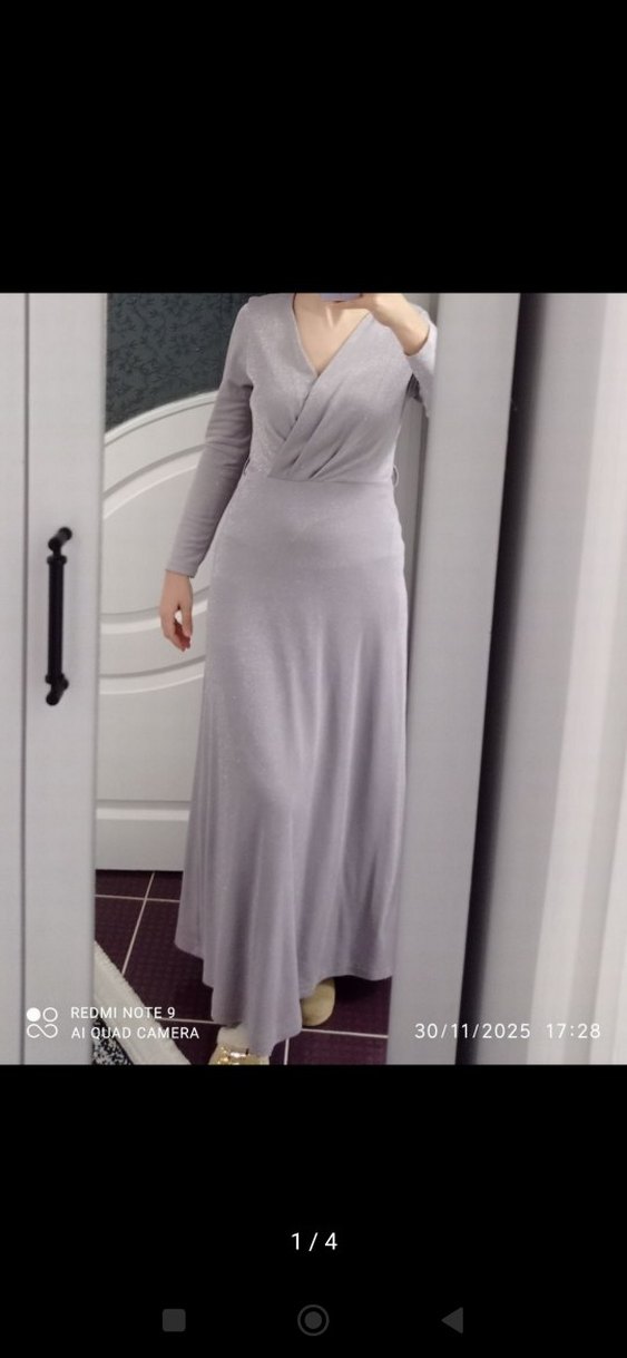 V yaka ve uzun kollu, drapeli tasarıma sahip, gri renkte, yumuşak dokulu sentetik kumaştan yapılmış, klasik şıklıkta fitted uzun elbise.