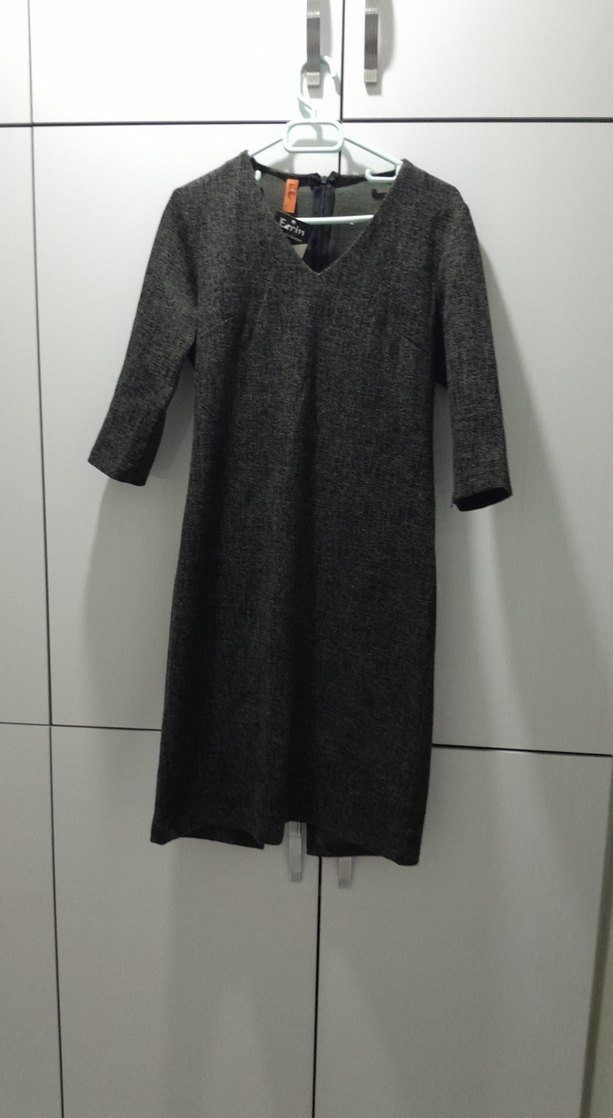 Gri renkte, V yakalı ve uzun kollu örgü elbise, ofis kullanımı için uygun düzenli kesime sahiptir. Desensiz ve sade normcore tarzındadır.