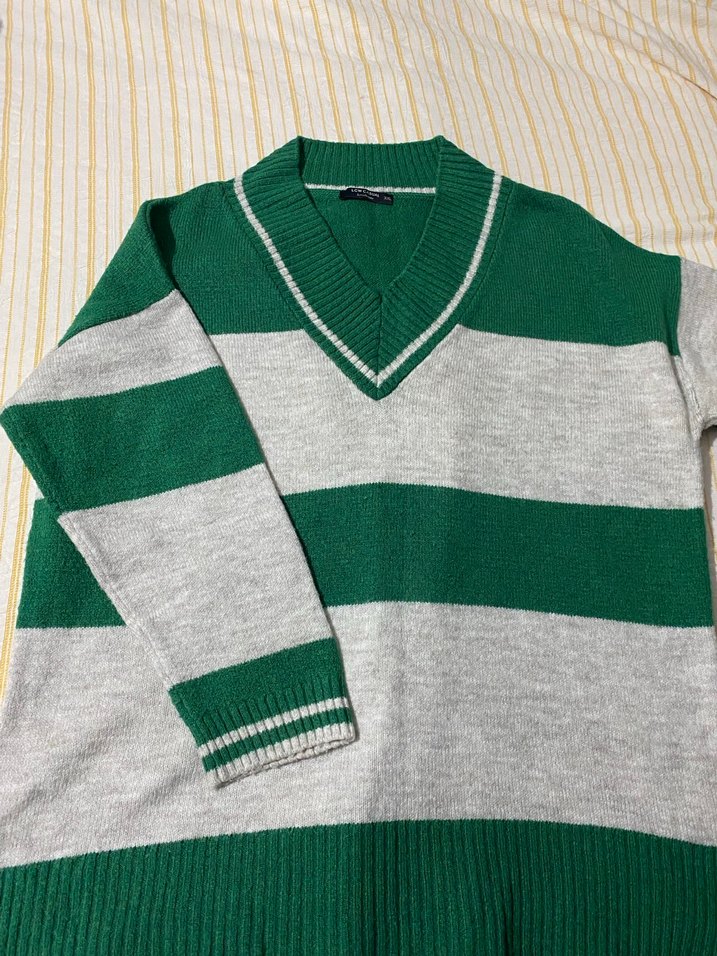 V yaka ve uzun kollu, gevşek kesim kadın kazak. Yumuşak örgü kumaştan, gri ve yeşil çizgili, rahat ve günlük tarzda.