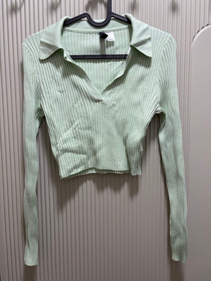 V yaka, uzun kollu ve triko kumaştan yapılmış, yağ yeşili renkte kadın kazak. Crop kesim ve günlük rahat stil için uygundur.