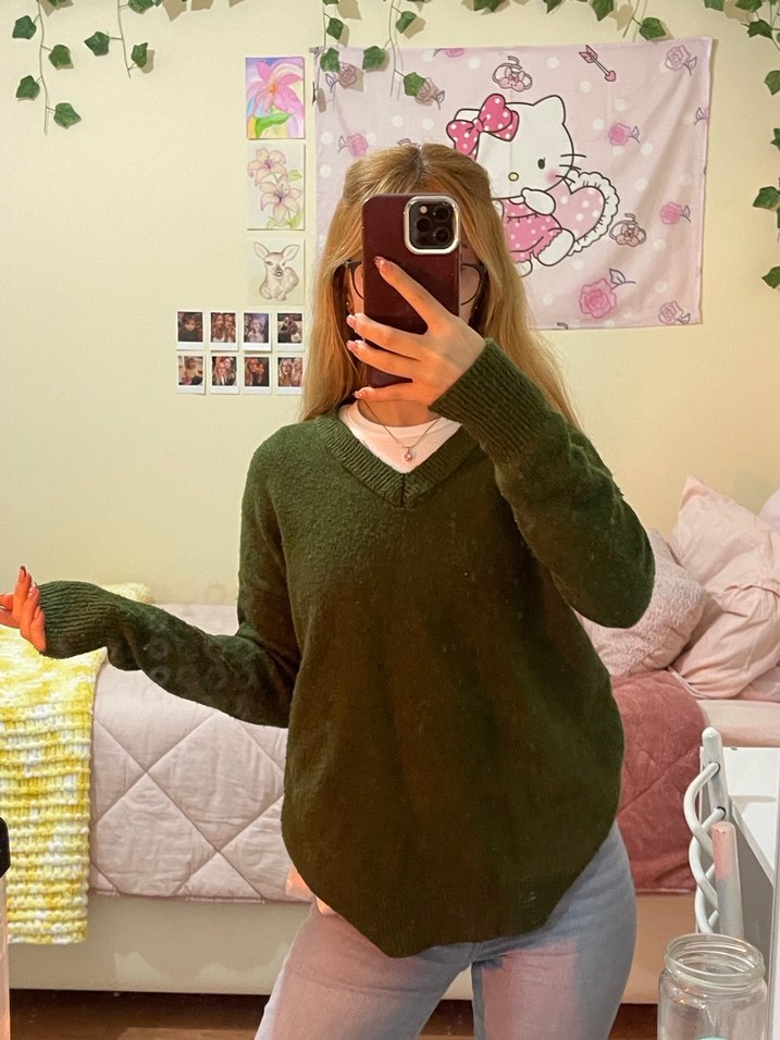 Uzun kollu, V yaka ve bol kesim haki renk triko kazak, günlük kullanıma uygun rahat ve sade normcore tarzda.