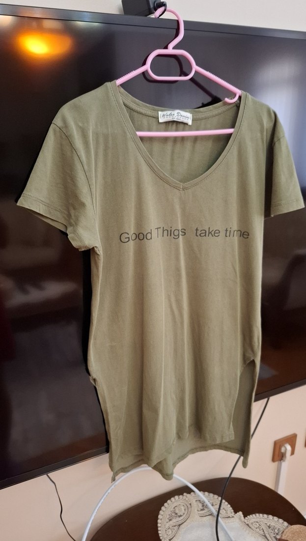 V yaka, kısa kollu, bol kesim, haki süet malzemeden tişört. Üzerinde baskılı slogan ile rahat sokak tarzı sunar.iade yoktur Boy önde:70cm arka:74cm