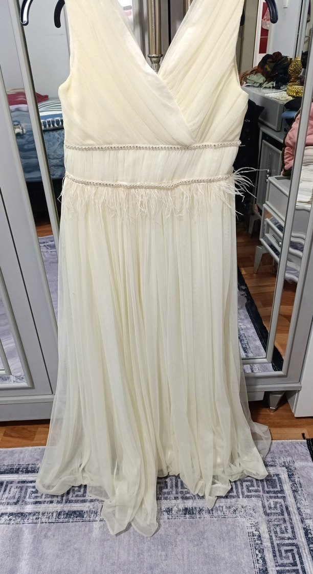 Uzun, ince askılı, V yakalı, A kesim beyaz gelinlik. Belinde tüy detaylarıyla bohem ve klasik şıklığı bir arada sunar.