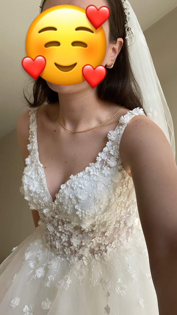 Beyaz midi boy A kesim gelinlik, V yaka ve ince askılarla, klasik ve vintage esintili bohem tarzda, zarif çiçek detaylarıyla süslenmiştir.