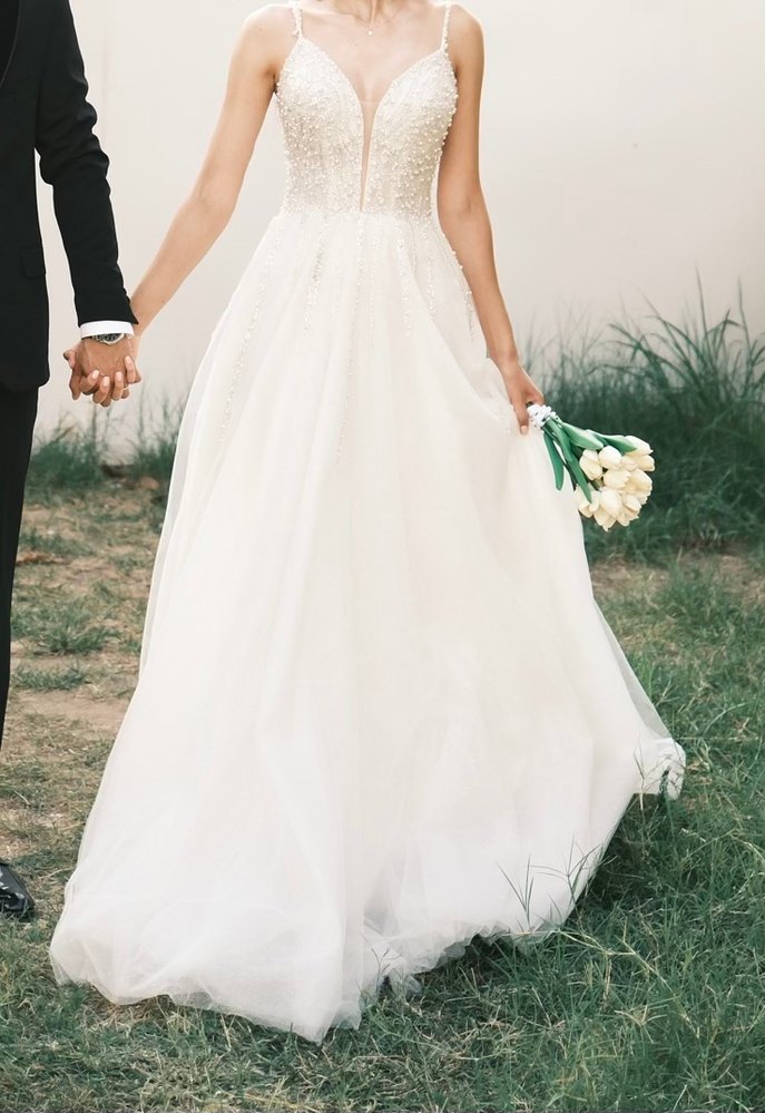 S beden, arkası ipli. Tarlatanı var, ama görseller tarlatansız. Hiç bir hasarı yok. Kuyruğu biraz uzun. Üst kısmı incili taşlı. Eteği su yolu pırlantalı. Umarım şans getirir