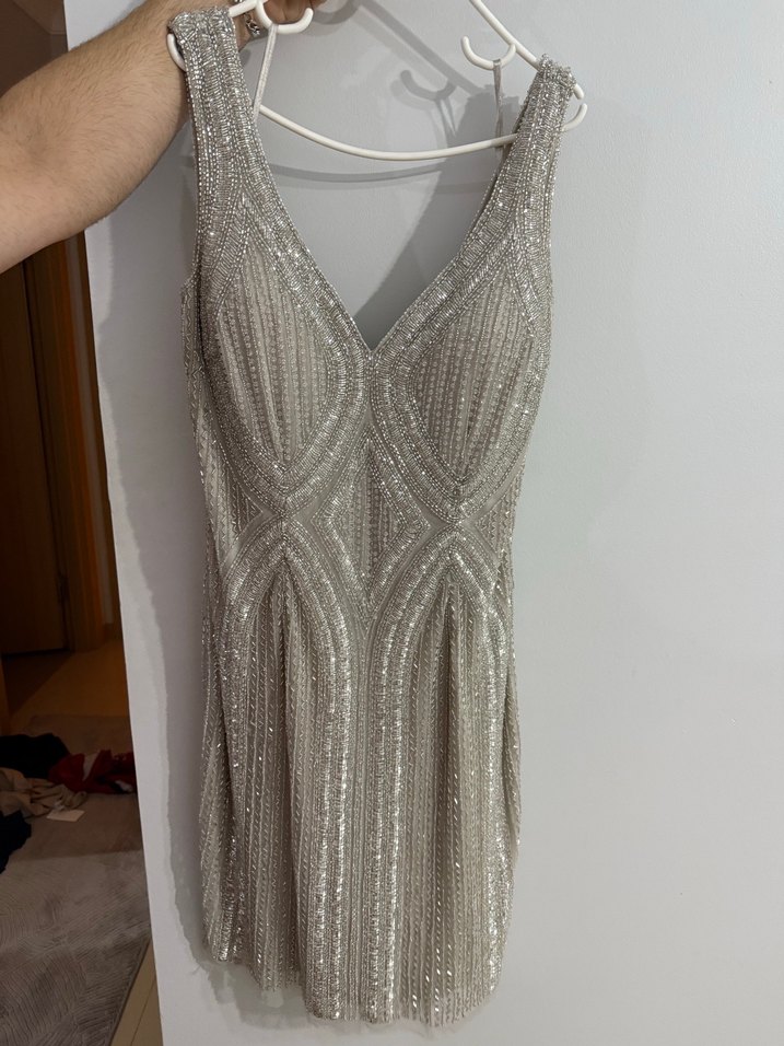 V yaka, kolsuz, işleme ve boncuk detaylı, vücuda oturan midi uzunlukta gri-bej elbise. Partiler için uygun elbısenın yapısı esnektir 42/44 beden için uygundur 1 kere kullanıldı ✨