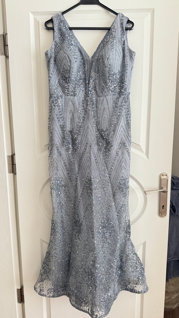 V yaka ve kolsuz kesime sahip, işlemeli drapeli uzun gri abiye elbise. Düğün gibi özel anlar için şık ve modern bir tercih. ✨ bir kere giyildi tertemiz