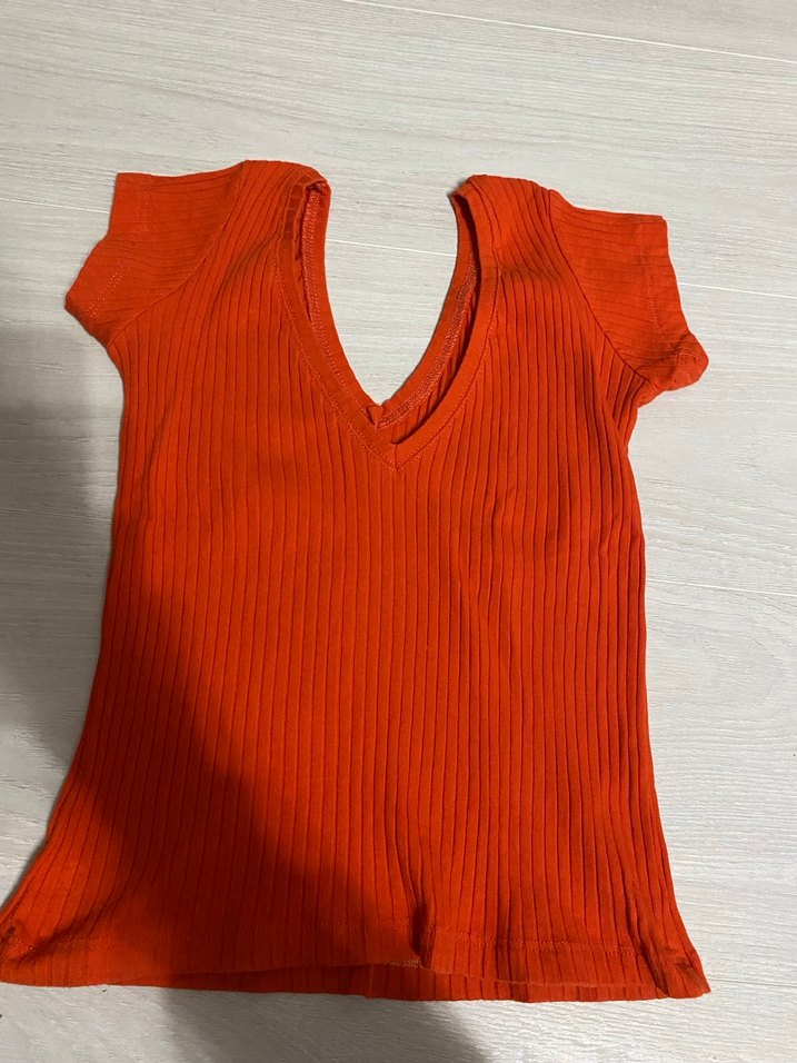 Kiremit renkli, V yaka ve kısa kollu, pilili detaylara sahip, vücuda oturan kadın bluz. Normal midi uzunlukta, sentetik yumuşak kumaştan. Günlük sokak stiline uygun.