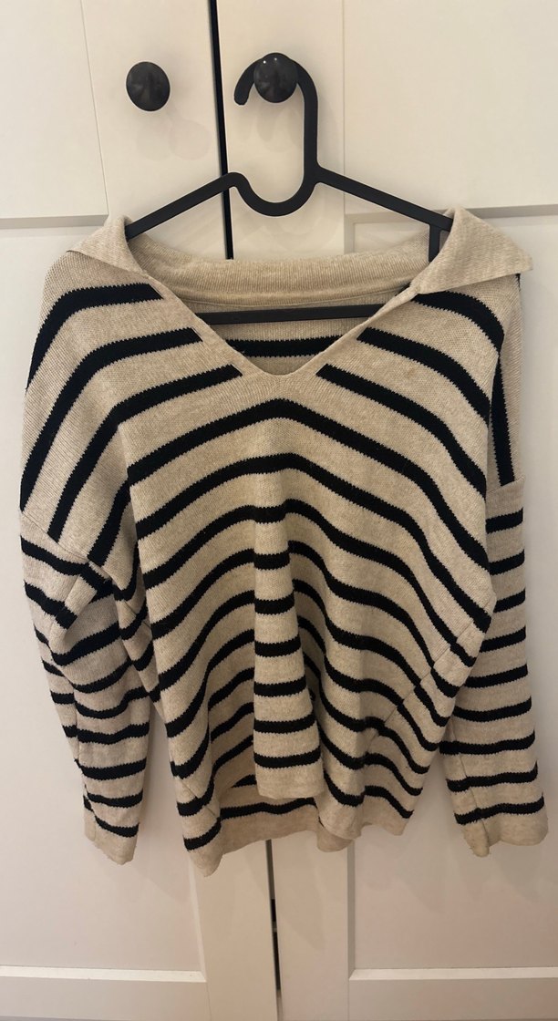 Bej ve gri çizgili, V yakalı ve uzun kollu örgü yün kazak. Rahat ve bol kesimiyle günlük kullanıma uygundur.