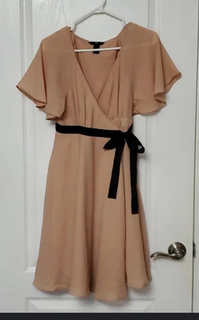 somon renkli, V yaka kruvaze kuşaklı elbise.