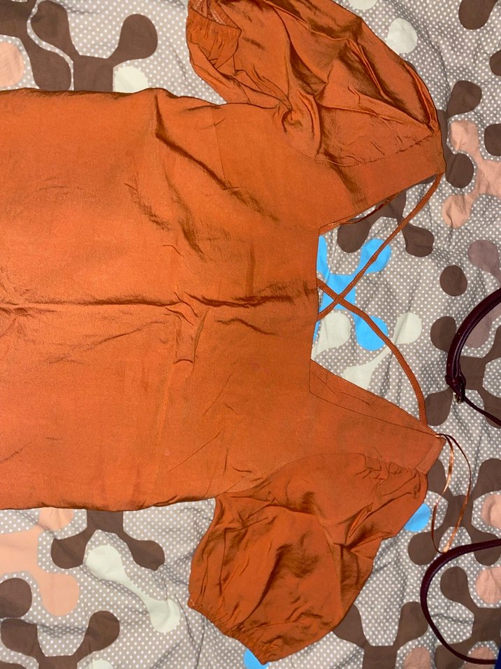 Kahverengi kadın bluz, V yaka ve ince askılı, dökümlü ve bol kesimdir. Yumuşak sentetik kumaştan, bohem tarzda, normal midi boyda, günlük kullanıma uygundur.