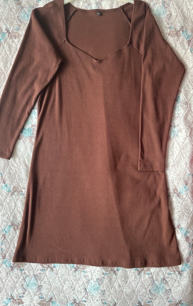 V yakalı, uzun kollu, kahverengi elbise. Trendyoldan aldım hiç giymedim. 4Xl
