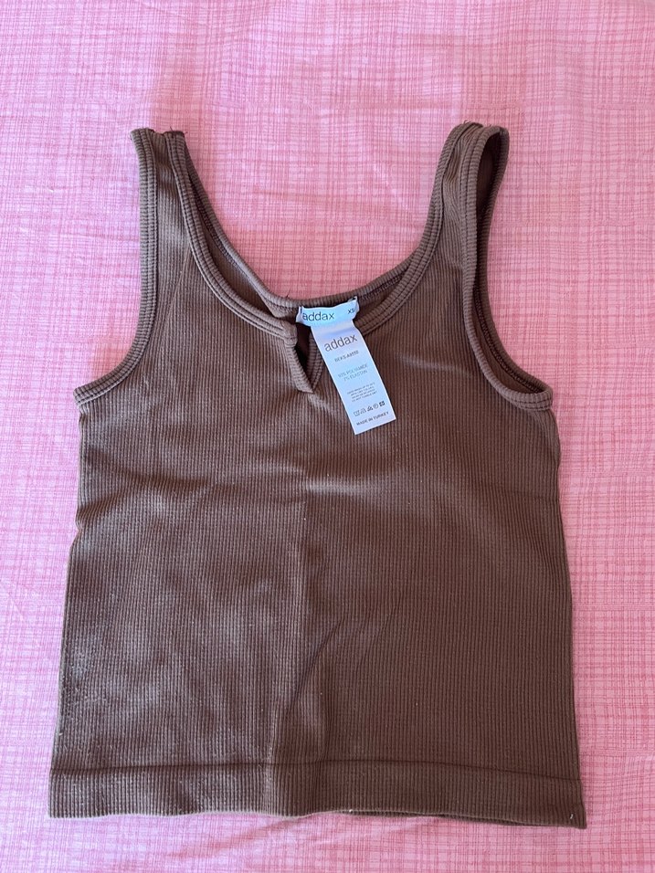 V yaka, kolsuz, pastel kahverengi kadın atlet, düz ve fitted kesim. Yumuşak sentetik kumaştan, günlük kullanım için uygun. Seamless kumaştan. Ufak tülerme var ama çok değil