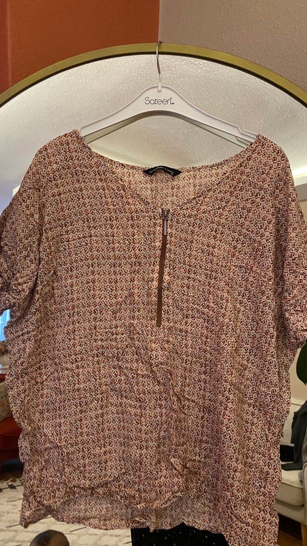 Bol kesim, V yakalı kahverengi keten bluz. Önünde fermuar ve parlak dokunuşu var, bohem tarz için uygun. ✨