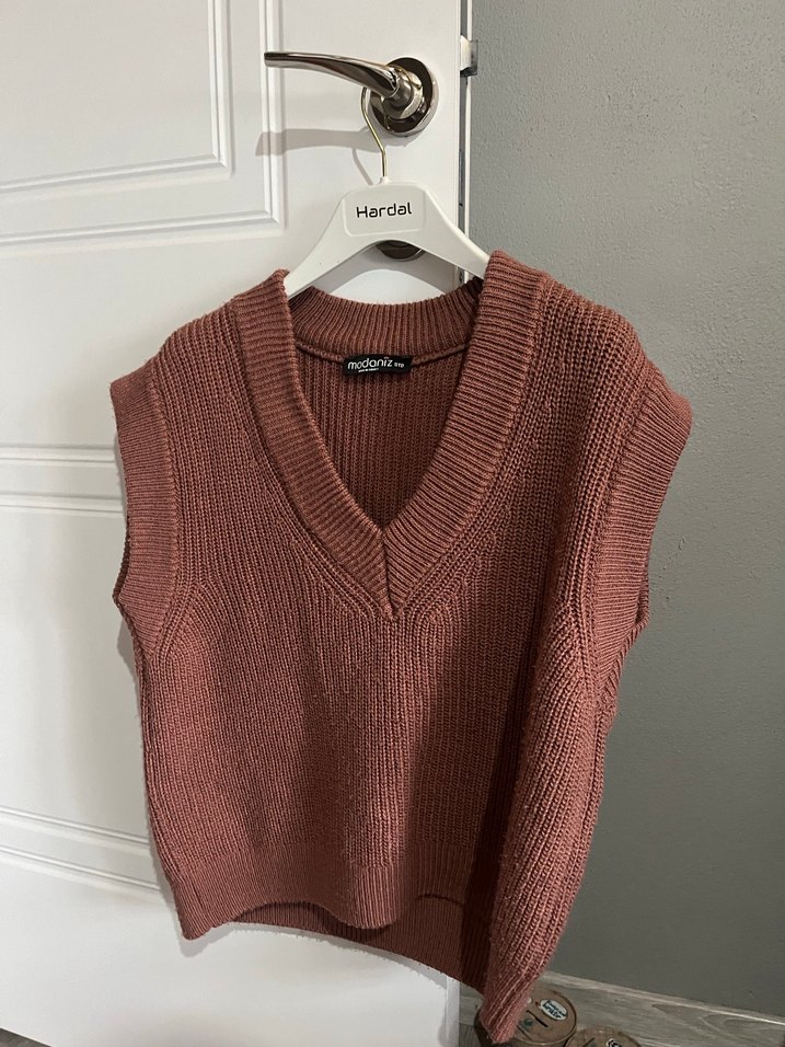 Kahverengi, V yakalı, örgü dokulu, kısa ve bol kesim süveter. Desensiz, rahat sokak stili için uygun.