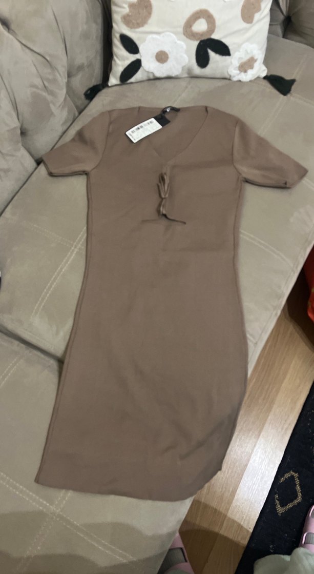 Kahverengi kumaştan, V yakalı ve kısa kollu, vücuda oturan midi elbise. Sade tasarımıyla günlük kullanıma uygundur, rahat ve şık bir görünüm sunar.