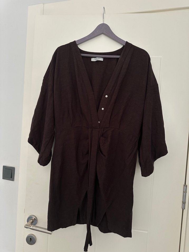 V yaka, kısa kollu, kahverengi renkli, midi uzunlukta, bol kesim ve desen içermeyen hemşirelik sabahlığıdır.