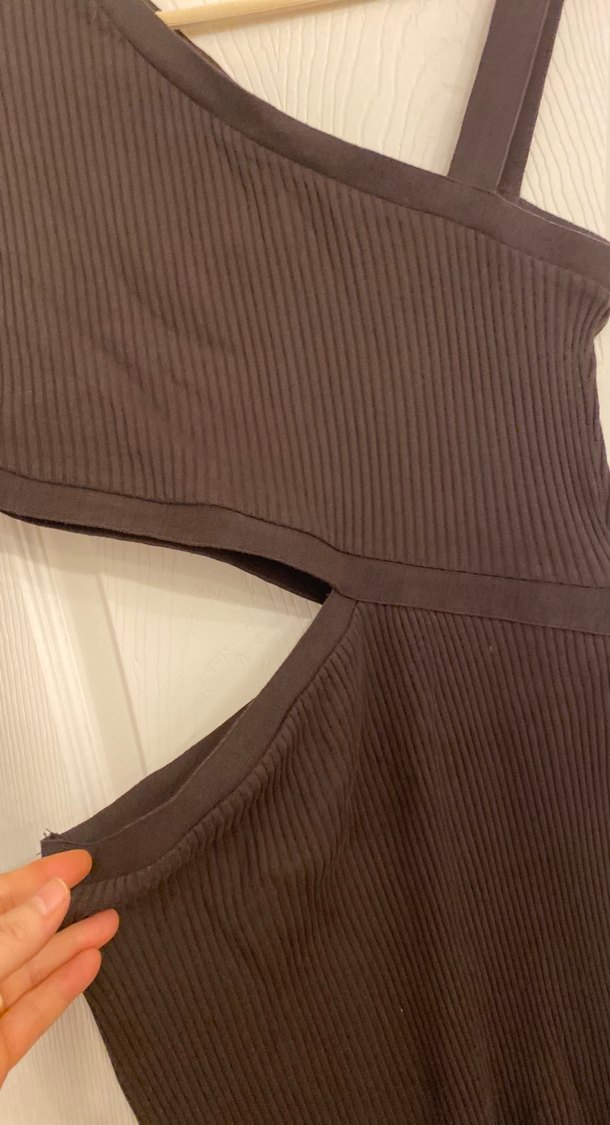 V yaka ve yırtmaç detaylı kahverengi, esnek sentetik kumaştan yapılmış, kolsuz ve midi uzunlukta triko elbise.