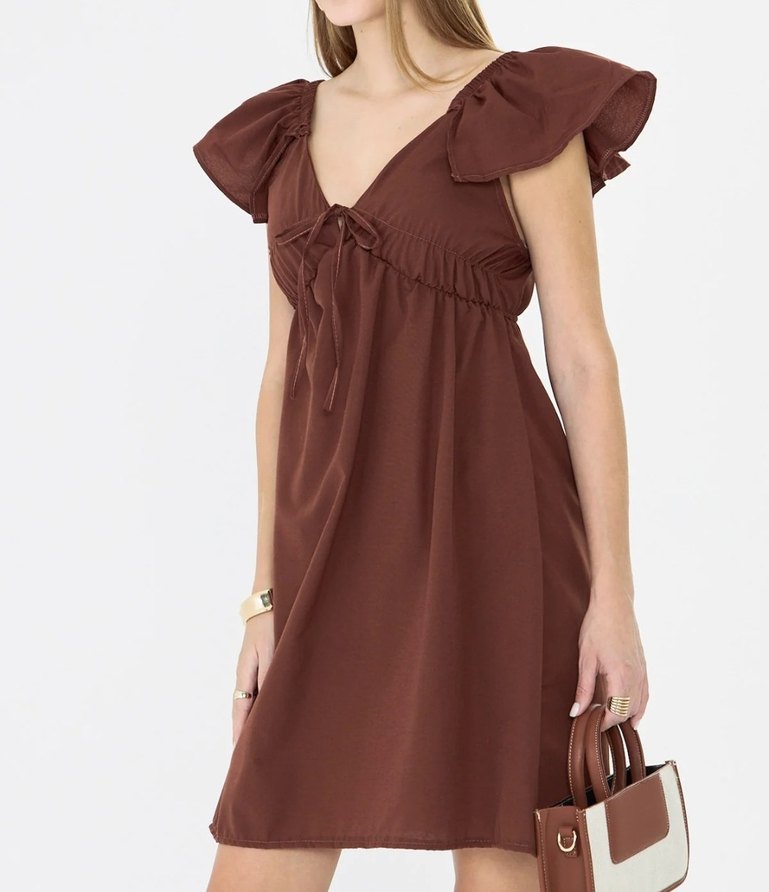 V Yaka Kahverengi Mini Elbise