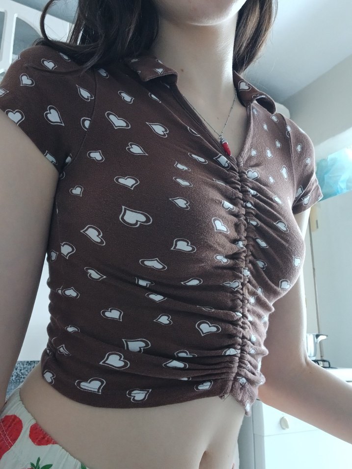 Düğmeli, V yakalı ve kısa kollu, kahverengi tonlarında kalp desenli tişört.