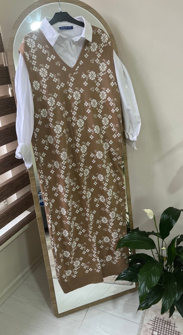 V Yaka Kahverengi Örgü Bohem Uzun Elbise ve gömlek hediyeli