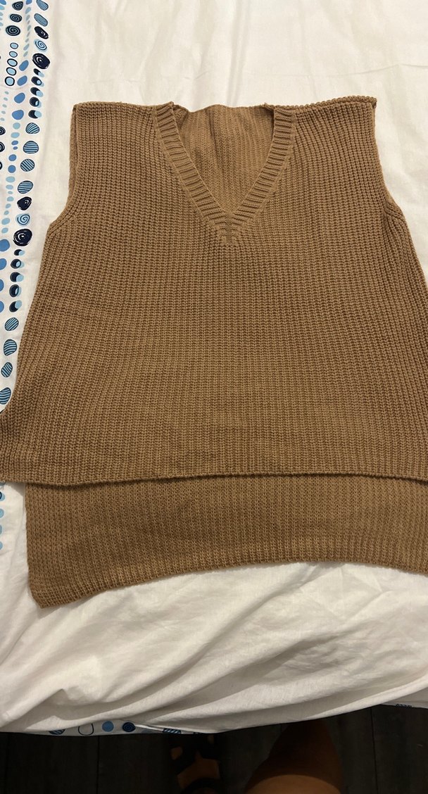 Kahverengi, V yakalı, örgü, kolsuz süveter. Rahat kesimi ve sıcak dokusuyla günlük kullanıma uygun.