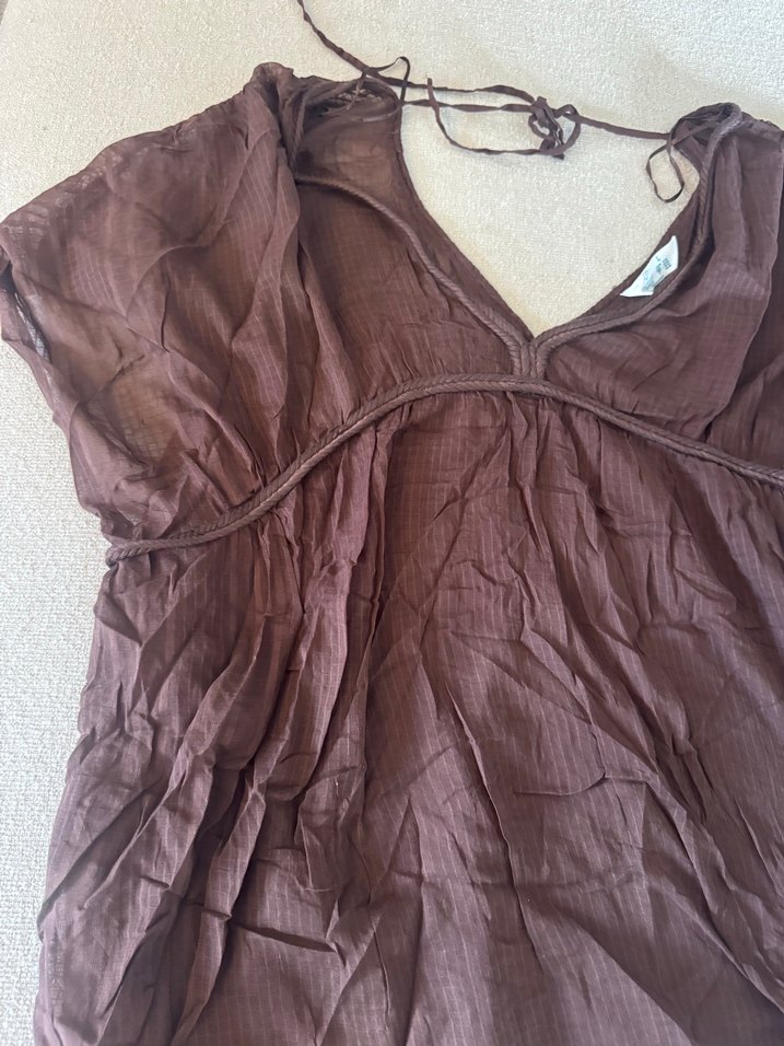 Yumuşak keten kumaştan, V yakalı, kahverengi, drapeli ve salaş kesim pareo Askılı kolları ve bohem tarzı ile günlük kullanıma uygundur.
