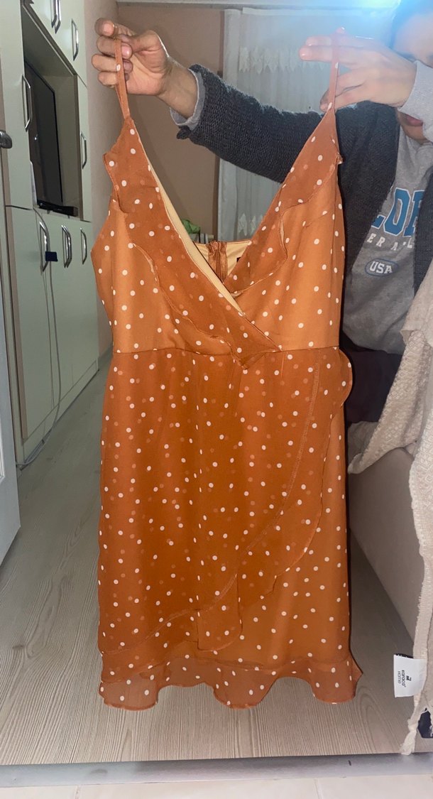 V yaka, kolsuz, kahverengi parlak sentetik kumaştan, beyaz puantiyeli, drapeli, fitted kesim midi elbise.
