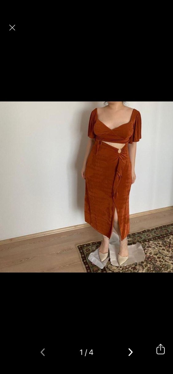 1 kez giyildi çok şık ve tatlı bir elbise stokları tükenmiştir. Kahverengi süet uzun elbise, bol kesim, drapeli detaylar, V yaka ve askılı kollara sahiptir. Parlak dokusu ve minimalist bohem tarzıyla romantik akşamlar için uygundur. Rengi kiremittir.