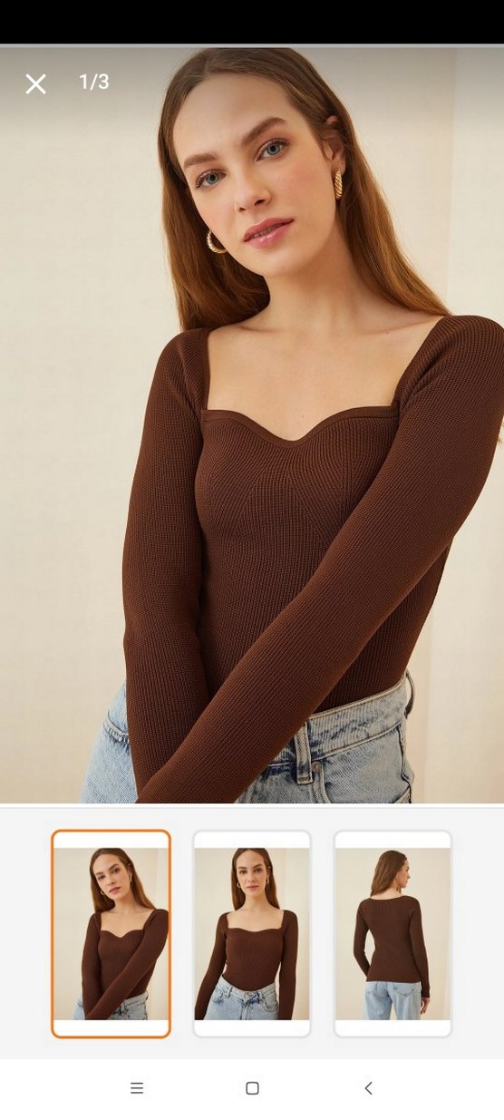 V yaka, uzun kollu, kahverengi triko kumaştan yapılmış, vücuda oturan midi uzunlukta bluz. Günlük sokak stili için uygundur.