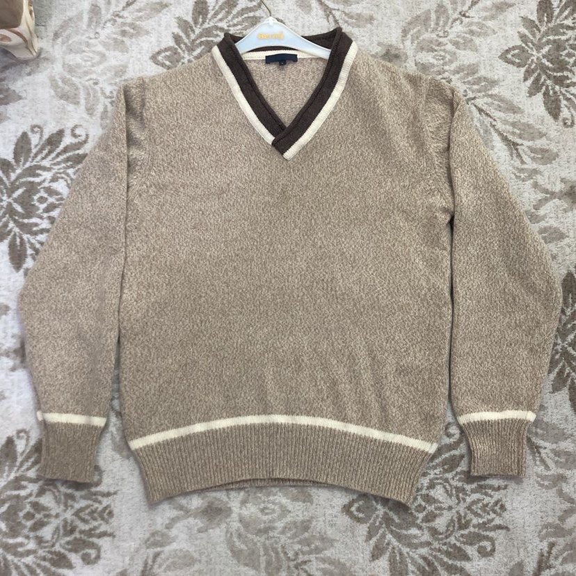 V yaka ve uzun kollu, kahverengi triko kazak. Rahat kesimi ve normal boyuyla günlük kullanım için uygundur.