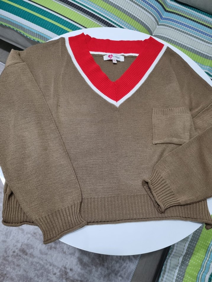 Koton V yaka, geniş kesim, kısa kazak, gömlek üstünde güzel duruyor. Xs beden fakat kalıbı geniş olduğu için M bedene kadar uyumludur.