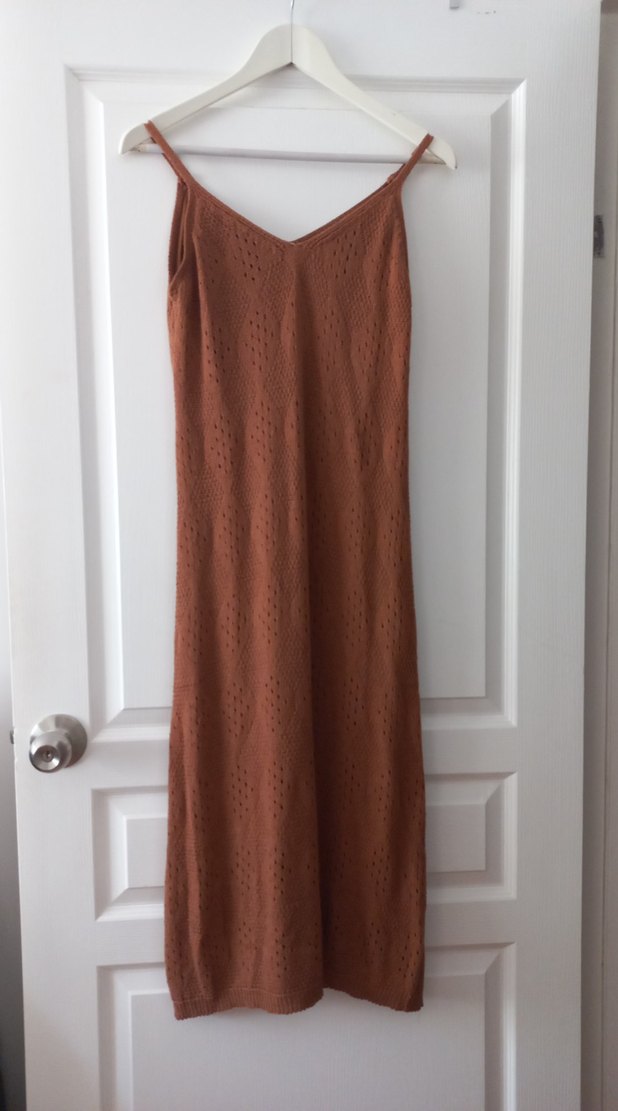 V yaka, kolsuz ve fitted kesim kahverengi triko uzun elbise. Bohem tarzıyla günlük kullanıma uygundur.