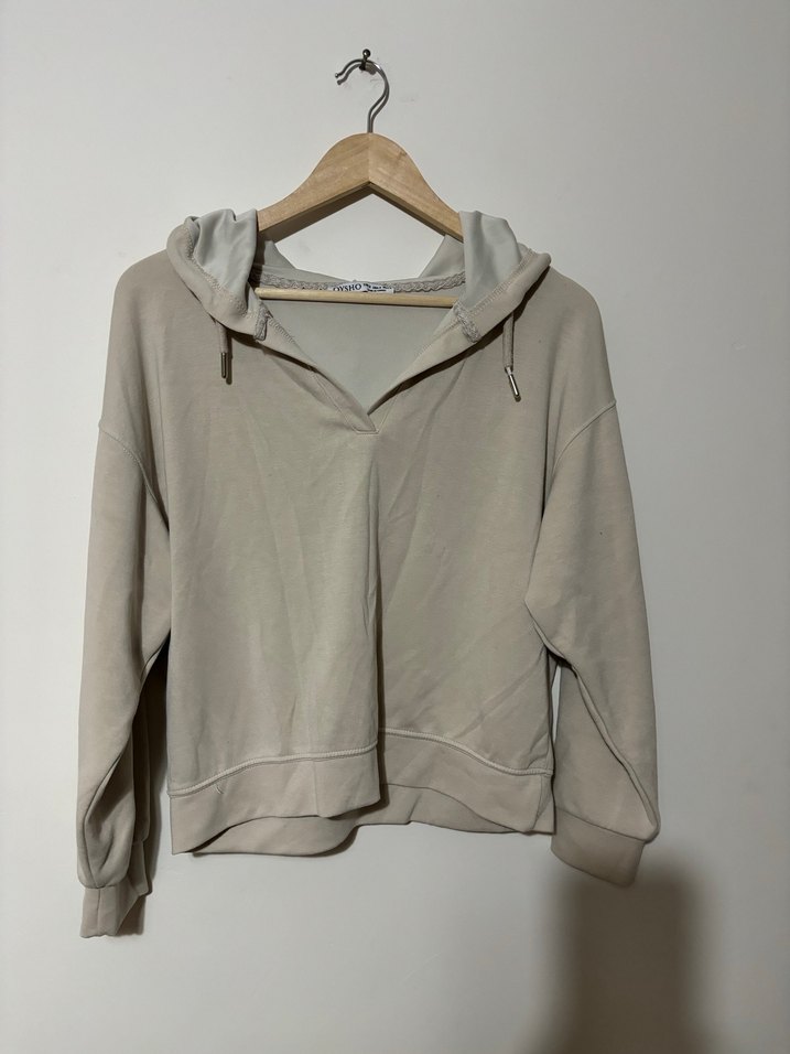Bej renk kadın sweatshirt. Orijinal değil fakat malı güzel model kumaş şeklinde. En sona üzerimde duruşunu ekledim. Boyum 156 kilom 50