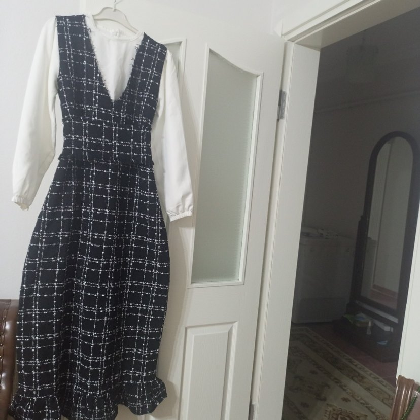 V yaka, kolsuz ve uzun kesime sahip bu elbise, koyu kareli deseni ve fırfır detaylarıyla modern klasik tarzda, ofis kullanımı için uygundur.