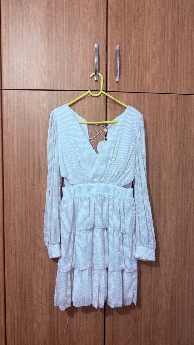 Beyaz renkli, V yakalı ve uzun kollu elbise, kat kat ve pileli tasarıma sahiptir. Rahat kesimli, bağcıklı sırt detayıyla bohem tarzda parti elbisesi. Bel kısmı ayrıntılı, kollarında açıklık var. Üstte çok güzel duruyor. Diz üstüne geliyor