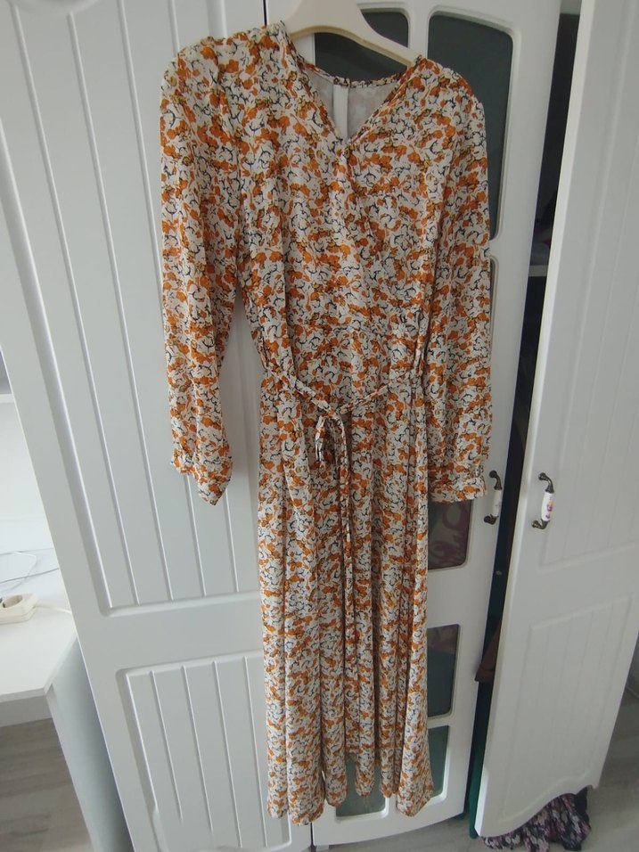 V yaka, uzun kollu, kemerli bohem elbise. Yumuşak sentetik kumaştan, bej tonlarında batik desenli, bol kesim.