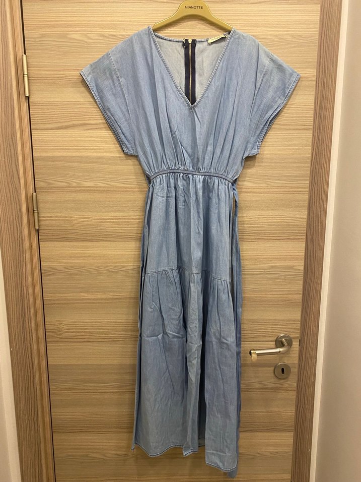 Uzun boylu denim elbise, bol kesim, V yakalı ve kemerli. Bohem tarzda, kısa kollu, mavi tonlarında, Günlük kullanıma uygundur. 1-2kez giyildi sorunsuzdur.