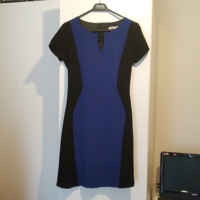 V yaka, kısa kollu, kemerli kalem elbise. Koyu mavi ve siyah renkleriyle ofis için uygun, sentetik kumaştan midi boy.